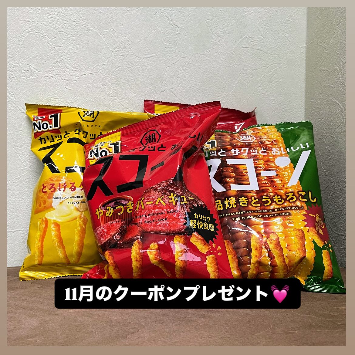 Special coupon 11/1(土)~11/30(日)まで 『秋の夜長のひとときに❣️』 湖池屋のスコーン (とろけるチーズ味) (絶品焼きとうもろこし味) (やみつきバーベキュー味) 1つプレゼント! |